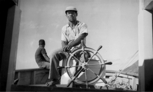 Zeph McLaren at Mermaid’s helm. Que Que in the stern.