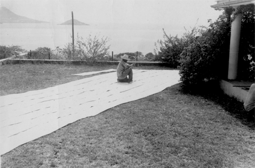 Stitching Mermaid’s sails at ‘Tranquility’, Linton Rigg’s home.